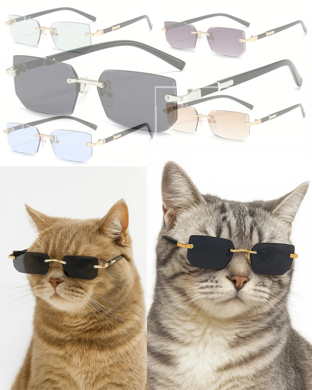 😎 Sleek, Lightweight, And Effortless, LooksMaxing And Sexy: These rimless rectangle shades feel light on your face and heavy on style. Minimalist look and maximum cool. These Sunglasses provide unlimited fame and recognition, appealing in every way possible, even on your cat! The sleek design of the sunglasses provides that extra bounce towards making your day!